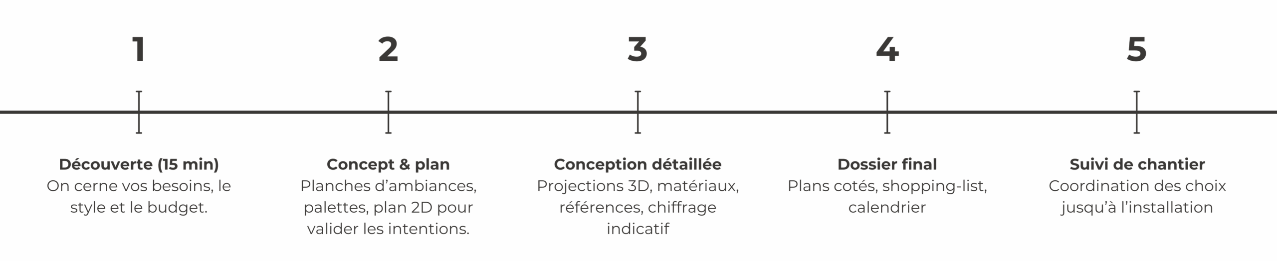 Les prestations complètes de design d’intérieurs peuvent aller de plusieurs semaines à plusieurs mois en fonction des projets, en fonction du niveau de détail, de la taille du projet et du calendrier des artisans.